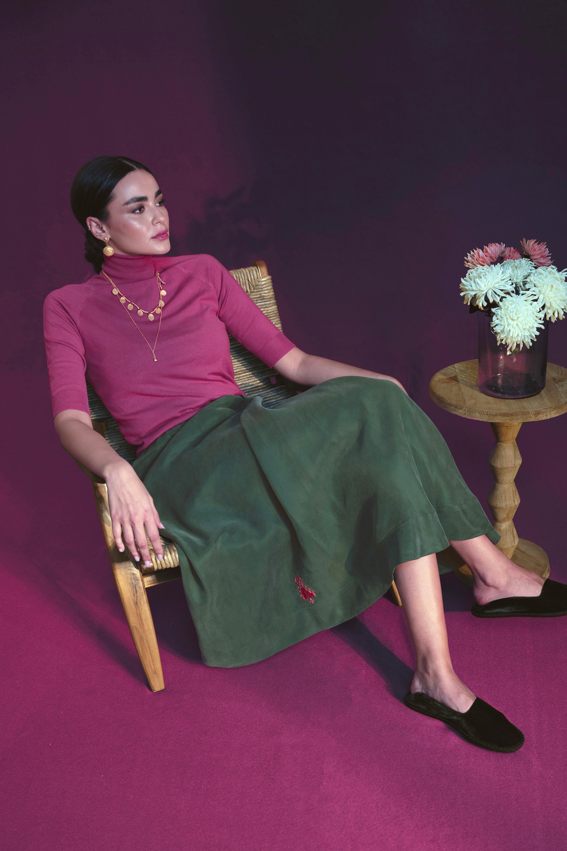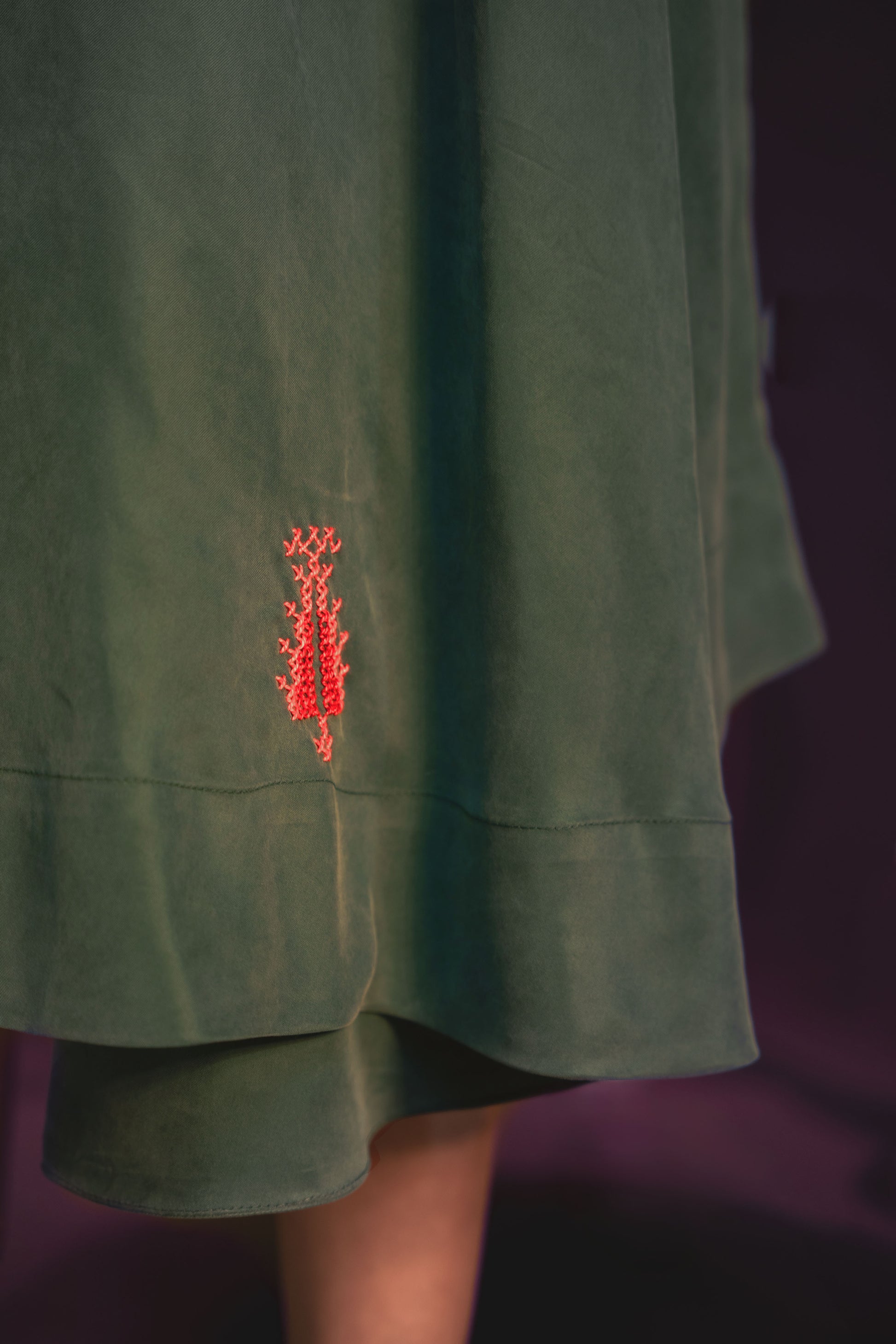 Material and finishes: Silky Cupro fabric, with hand embroidered red motif.
