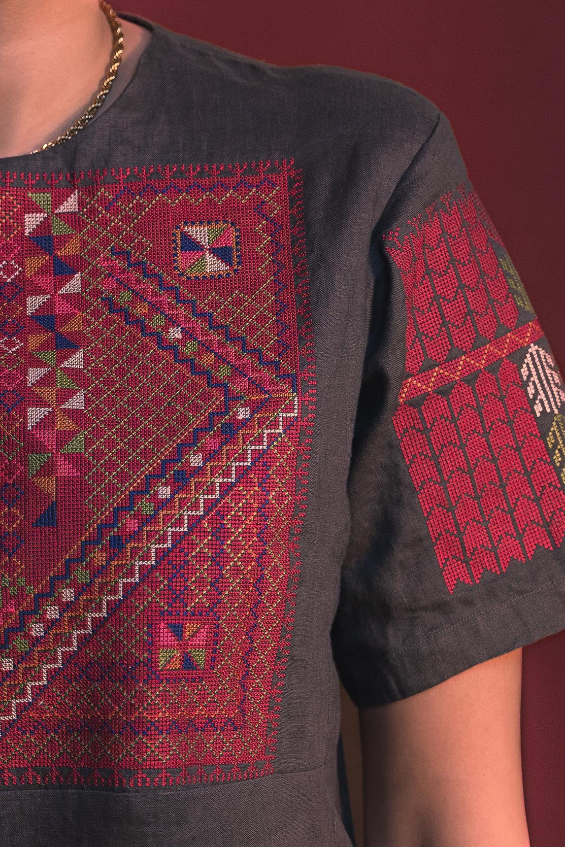 Material and finishes: Medium weight 100% linen fabric, machine embroidered chest and sleeves.